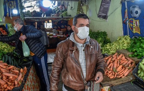 | Des Algériens portant des masques achètent des légumes dans un marché de Khraicia, à 20 km au sud de la capitale Alger, le 25 avril. |