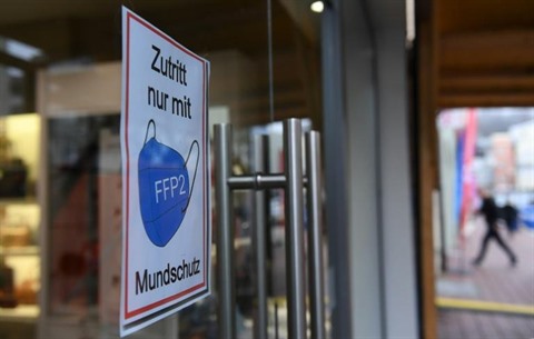 | Une affiche rappelant de porter un masque de protection à l'entrée d'une boutique, le 24 novembre à Muhldorf am Inn, en Allemagne. |