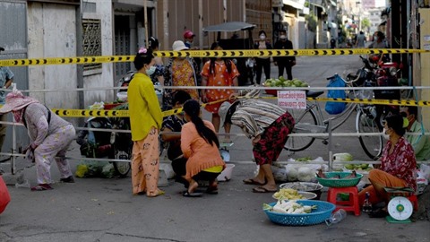 | Des personnes achètent des légumes à côté d'une barricade installée dans un quartier en raison des restrictions contre le COVID-19, à Phnom Penh, le 25 avril 2021. |