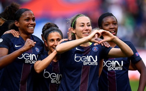 | Les joueuses du PSG victorieuses du FC Barcelone avec notamment un but de Sabrina Delannoy, le 29 avril au Parc des princes. |