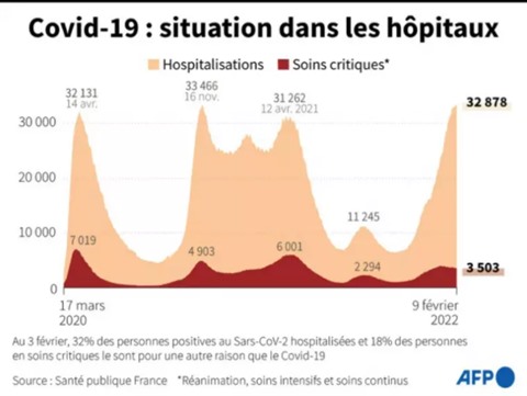 | Graphique montrant l'évolution des hospitalisations et des personnes en soins critiques en France, au 9 février. |