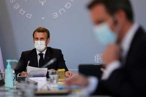 | Le président Emmanuel Macron lors d'un Conseil de défense à l'Élysée avec le ministre de la Santé, Olivier Veran, le 12 novembre 2020 à Paris. |
