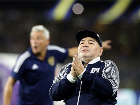 | La star argentine du football Diego Maradona est applaudie par les fans de Boca Juniors à la Bombonera lors d'un match de championnat contre son équipe de Gimnasia y Esgrima La Plata à Buenos Aires, le 7 mars. |