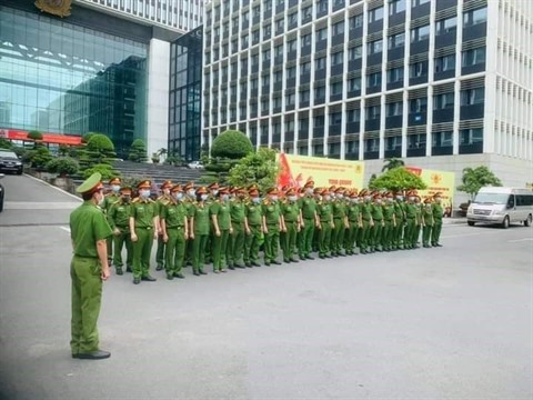 | Des cadres et policiers du Département de police chargé de la gestion administrative de l'ordre social, revelant du ministère de la Police, avant leur départ le 22 août de Hanoï. |