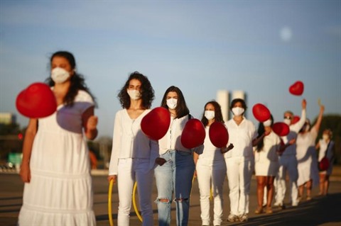 | Des artistes brésiliens rendent hommage aux morts du COVID-19 lors d'une représentation à Brasilia, le 8 juin. |