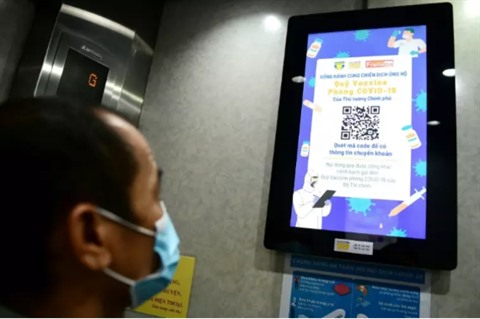 | Un écran dans un ascenceur affiche un message invitant les Vietnamiens à contribuer à un fonds pour le vaccin contre le COVID-19, le 8 juin à Hanoï. |