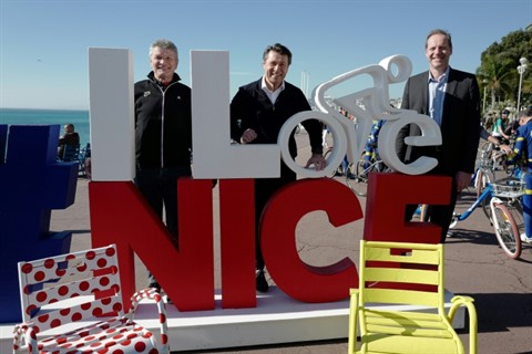 | Le maire de Nice, Christian Estrosi, entouré de la légende Bernard Thévenet et du Monsieur Tour de France, Christian Prudhomme (droite), le 4 février sur la Promenade des Anglais d'où partira l'édition 2020. |