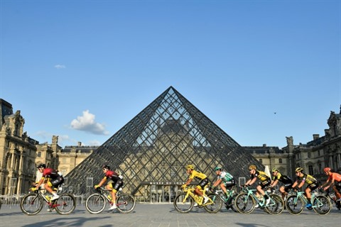 | Le peloton du Tour de France avance, étiré, devant la pyramide du Musée du Louvre, lors de l'ultime étape de l'édition courue à Paris, le 29 juillet 2019. |