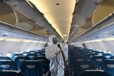 | Désinfection d'un avion de la compagnie Vietnam Airlines, à Hanoï le 3 mars. |
