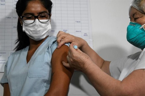 | Une soignante reçoit le vaccin russe contre le COVID-19, à l'hôpital Lagomaggiore de Mendoza, en Argentine, le 29 décembre. |