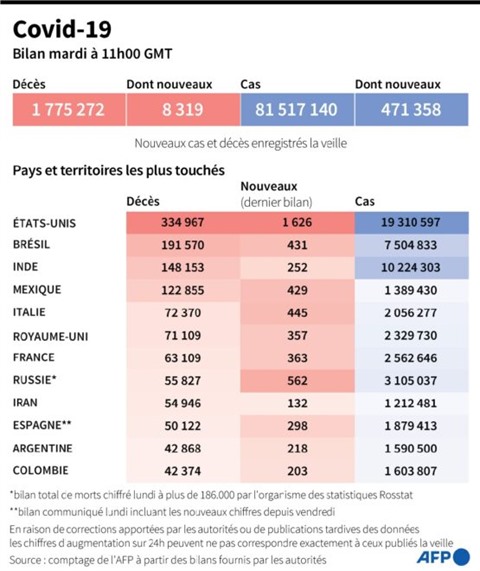 Le coronavirus a fait 1.775.272 morts dans le monde et contaminé plus de 81.517.140 personnes selon un comptage de l'AFP mardi 29 décembre, bien que les campagnes de vaccination prennent de la vitesse en Europe et sur le continent américain.