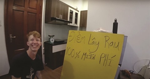 | L’Américain Chris Lewis a écrit lui-même ce panneau en vietnamien "Điêm lây rau 100% miên phí" (Point de fourniture de légumes 100% gratuits). |