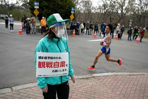 | Une volontaire de l'organisation japonaise invite, via sa pancarte, le public à se tenir loin du parcours du semi-marathon de Sapporo, le 5 mai. |
