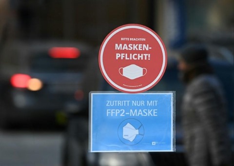 | Une affiche annonce que le port du masque est obligatoire pour entrer dans un magasin dans la ville d'Eggenfelden, dans le Sud de l'Allemagne, le 24 novembre. |