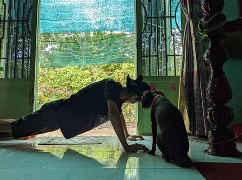 Vi Van Dinh (rue Xuân Thuy, à l'arrondisement de Câu Giây, à Hanoï) partage : ''J'avais l'habitude de faire du vélo autour du lac Thu Lê chaque matin, mais depuis l'épidémie, je fait mon sport quotidien à la maison, avec du matériel récemment acquis''.