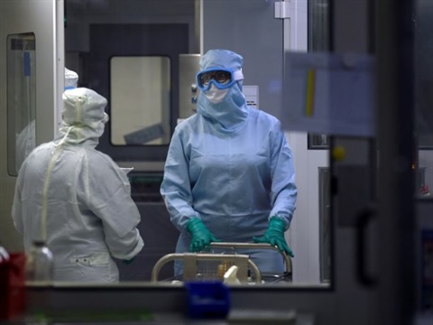 | Des employés en tenue stérile dans l'usine pharmaceutique Fareva de Poce-sur-Cisse, dans le Centre de la France, le 22 avril. |