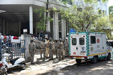 | Des policiers devant un hôpital à Nashik où 22 patients sont morts en raison d'une coupure d'alimentation en oxygène de ventilateurs, le 21 avril en Inde. |