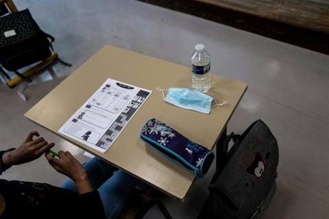 | Une table d'écolier à Lyon pendant la pandémie de COVID-19, le 14 mai 2020. |