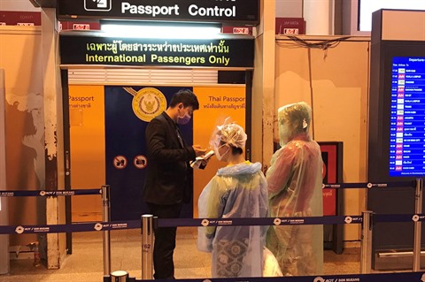 | Des passagers portant des masques faciaux et des ponchos jetables font vérifier leur passeport à l’aéroport international Don Mueang de Bangkok, en Thaïlande. |