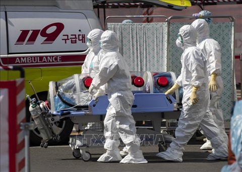 | Transport d'un patient du COVID-19 à un hôpital à Daegu, en République de Corée. |