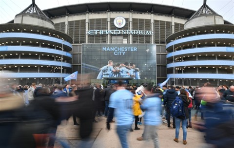 | Le stade Etihad de Manchester City, ici avant un match de C1 contre Liverpool, le 10 avril 2018. |