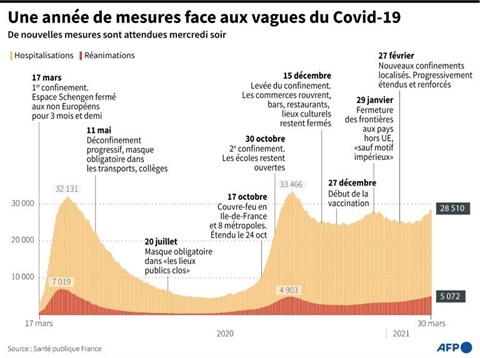 La situation sanitaire se dégrade depuis plusieurs semaines, avec plus de 5.000 patients en réanimation, au-delà du pic de la deuxième vague de novembre, mettant les hôpitaux sous très forte tension.