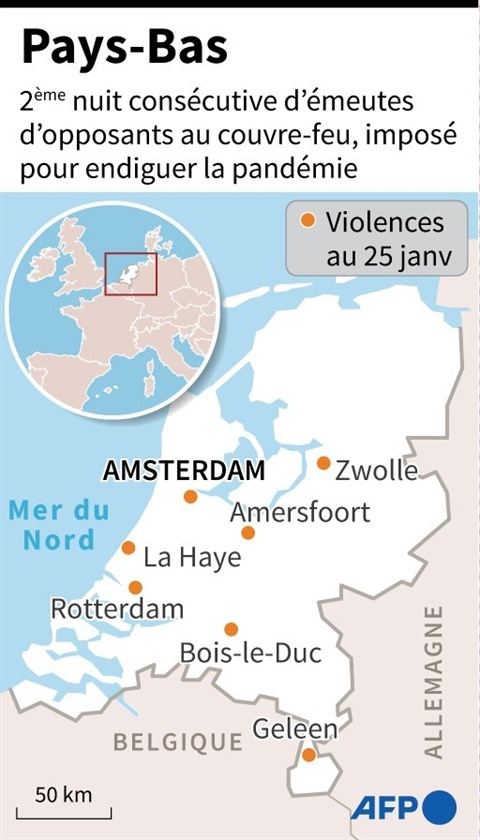 Aux Pays-Bas, après trois nuits de violentes émeutes dans plusieurs grandes villes et localités pour protester contre l'instauration d'un couvre-feu, une forte présence policière semblait mardi soir 26 janvier avoir empêché de nouveaux troubles.