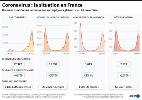 Les chiffres des autorités de santé indiquent vendredi 27 novembre une poursuite de la baisse des principaux indicateurs. À l'exception des décès avec 396 victimes du COVID-19 à l'hôpital en 24 heures, soit près de 52.000 personnes au total depuis le début de l'épidémie.