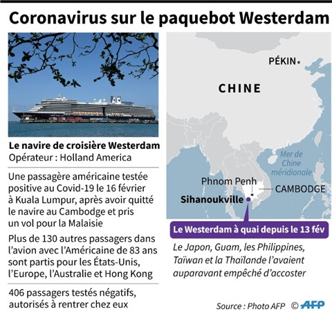 Samedi 15 février, le virus a été diagnostiqué chez une ex-passagère américaine de 83 ans. Mais des dizaines d'autres voyageurs ont, comme elle, déjà quitté le Cambodge, laissant craindre une propagation de l'épidémie.