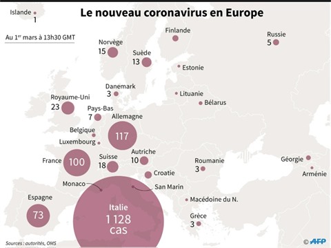 L'Hexagone est depuis samedi 29 févier l'un des principaux foyers du COVID-19 en Europe avec l'Italie et l'Allemagne, avec 130 cas depuis la fin janvier. Sur ces 130 personnes infectées, 12 sont guéries, 2 sont mortes et 116 hospitalisées, dont 9 dans un état grave, selon le dernier bilan annoncé dimanche soir 1er mars par le ministère de la Santé.