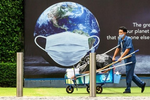 Un concierge pousse un chariot à Bangkok (Thaïlande), le 20 août.