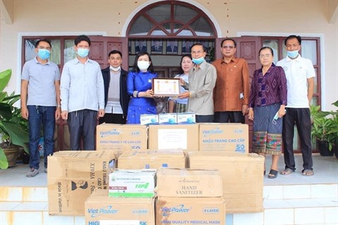 | Les représentants des Vietnamiens au Laos (gauche) remettent des cadeaux aux habitants laotiens pour lutter contre l'épidémie. |