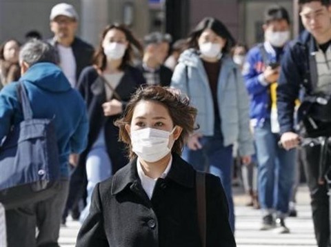 | Des personnes portent le masque de protection contre le COVID-19, le 20 février à Fukuoka (Japon). |