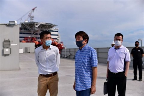 | Le ministre singapourien des Transports, Khaw Boon Wan (centre), à bord d'un logement flottant amarré au terminal de Tanjong Pagar, destiné à héberger des travailleurs migrants en bonne santé, le 12 avril. |