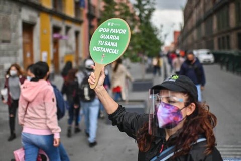 | Une femme brandit une pancarte invitant à respecter la distanciation sociale à Mexico City, le 18 septembre 2020. |