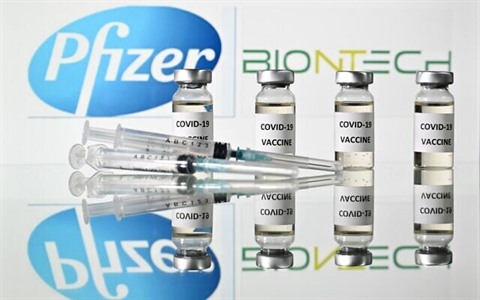 | Des flacons de vaccins anti-COVID-19 et des seringues avec le logo de la firme pharmaceutique américaine Pfizer et de son partenaire allemand BioNTech, le 17 novembre. |
