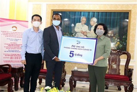 | Une responsable de Hô Chi Minh-Ville reçoit des dons d'une entreprise, le 10 avril. |