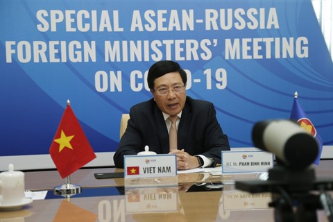 Le vice-Premier ministre et ministres des Affaires étrangères Pham Binh Minh a rappelé la stratégie anti-COVID-19 du gouvernement vietnamien qui consiste à contenir le virus et à relancer la production. Il a promis d’aider l’Organisation mondiale de la Santé et tous les pays à se résister et à éradiquer la pandémie dans les meilleurs délais. Il a demandé à la Russie de coopérer avec l'ASEAN pour lutter contre le virus et traiter les cas infectieux, tout en veillant à garantir les droits et l'égalité de traitement des citoyens de l'ASEAN en Russie et à promouvoir la coopération afin de minimiser l'impact socio-économique de la pandémie.