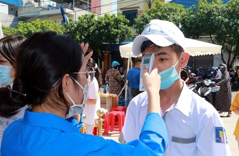 | Mesure de la température corporelle lors d'un concours d'entrée au lycée dans la province de Nam Dinh (Nord). |