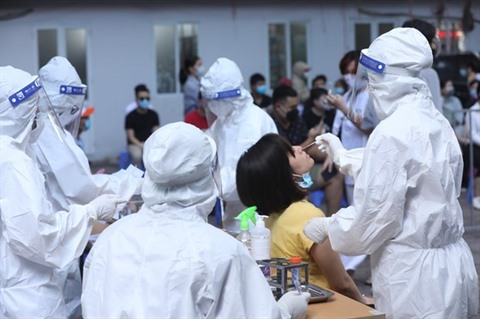 | Des agents du Centre médical de l'arrondissement de Hai Ba Trung, à Hanoï, prélèvent des échantillons pour les tests de dépistage du COVID-19 pour les personnes de retour de Hô Chi Minh-Ville, le 10 juillet 2021. |
