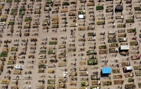 | Vue aérienne de tombes dans une section du cimetière municipal de Valle de Chalco, au Mexique, réservée aux personnes mortes du COVID-19, le 26 mars. |