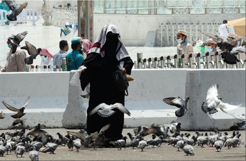 | Une femme donne à manger aux pigeons dans la ville de La Mecque, en Arabie saoudite, à la veille du hajj, le 16 juillet 2021. |