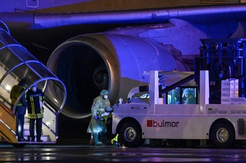 | Des secouristes transfèrent un malade du COVID-19 via un avion de l'armée allemande sur l'aéroport d'Osnabruck, le 26 novembre 2021. |