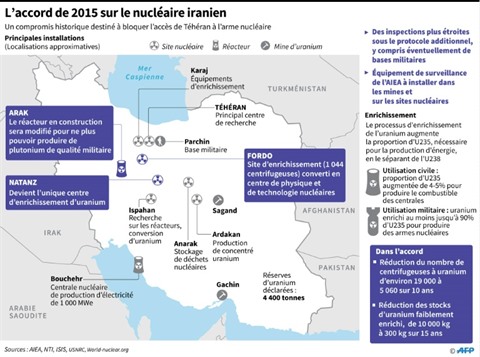 | Carte de l'Iran et de ses installations nucléaires et caractéristiques de l'accord de 2015 sur le nucléaire iranien. |
