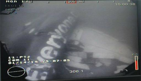 | Vue sous-marine des débris fuselage du vol QZ8501 d’AirAsia Indonesia en mer de Java, diffusée par la Marine singapourienne sur son compte facebook, le 14 janvier. |