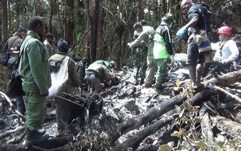 | Sur le lieu de l'accident d'un avion de ligne qui s'est écrasé le 16 août dans la jungle dans l'Est de l'Indonésie. |