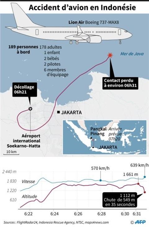 Le Boeing 737 MAX 8 de la compagnie indonésienne à bas coût entré en service il y a seulement quelques mois a disparu des radars lundi 29 octobre, 12 minutes après avoir décollé de Jakarta. Il s'est abîmé en mer de Java peu après avoir demandé au contrôle aérien l'autorisation de revenir dans la capitale indonésienne. Des dizaines de plongeurs ont été dépêchés sur le site de la disparition du vol JT 610, qui aggrave encore la réputation d'insécurité du secteur aérien indonésien. Mais dès lundi soir 29 octobre, les services de secours n'avaient plus guère d'espoir de trouver des survivants.