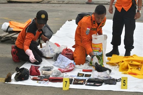 | Les secours indonésiens déposent des objets retrouvés près du lieu de l'accident de l'avion de Lion Air, au port de Jakarta, le 30 octobre. |