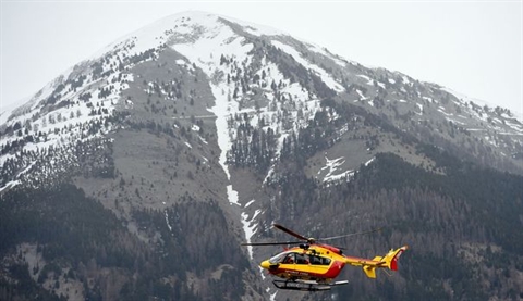 | Un hélicoptère de la sécurité civile survole le secteur où a eu lieu le crash d'un Airbus A320, mardi 24 mars dans les Alpes de Haute-Provence. |