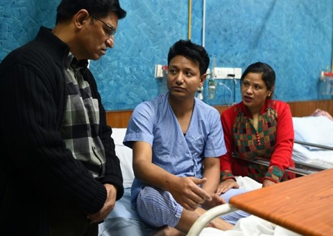 | Sanam Shakya (centre), survivant du crash de l'avion bangladais au Népal à l'hôpital de Katmandou, le 12 mars. |